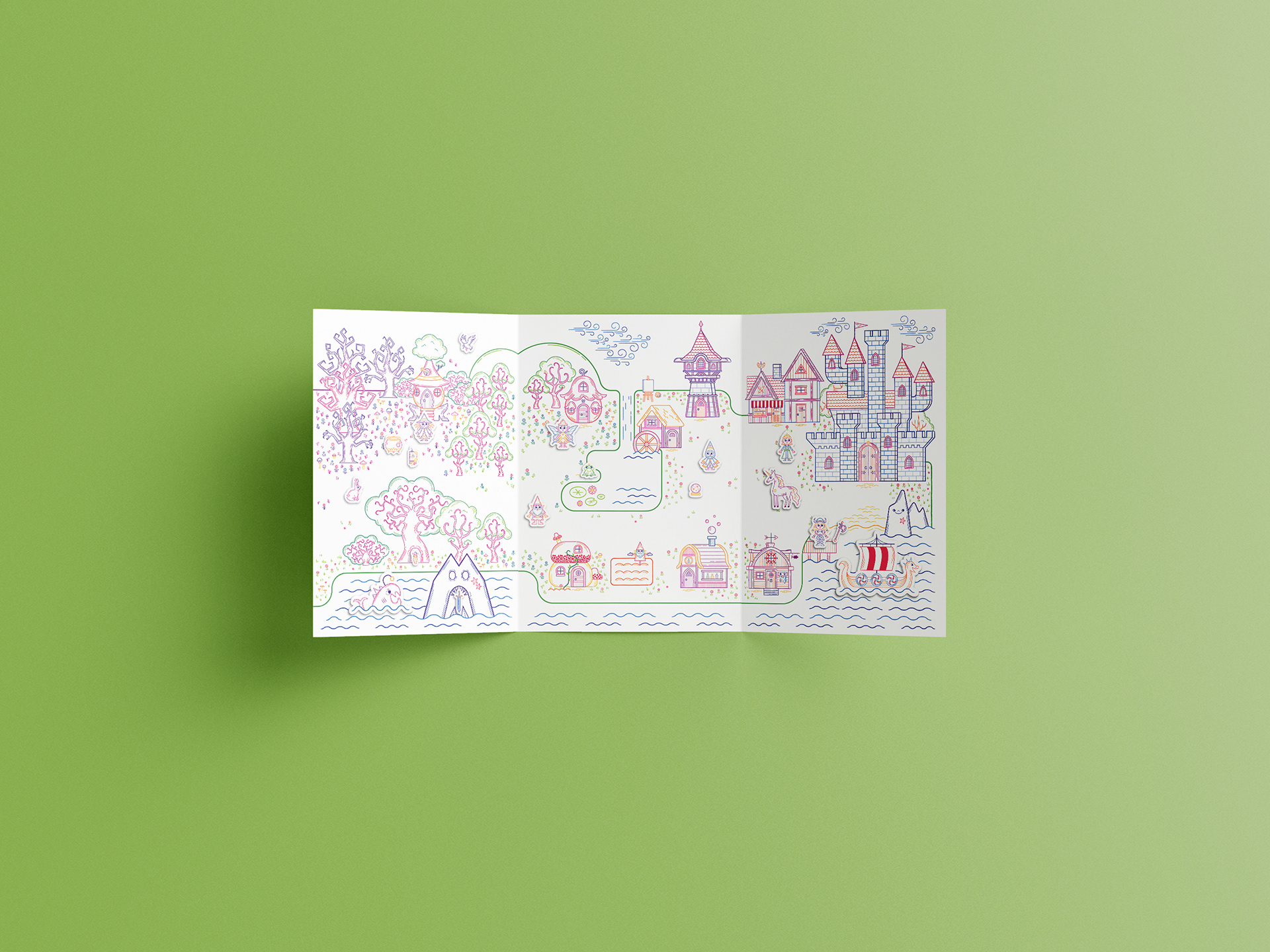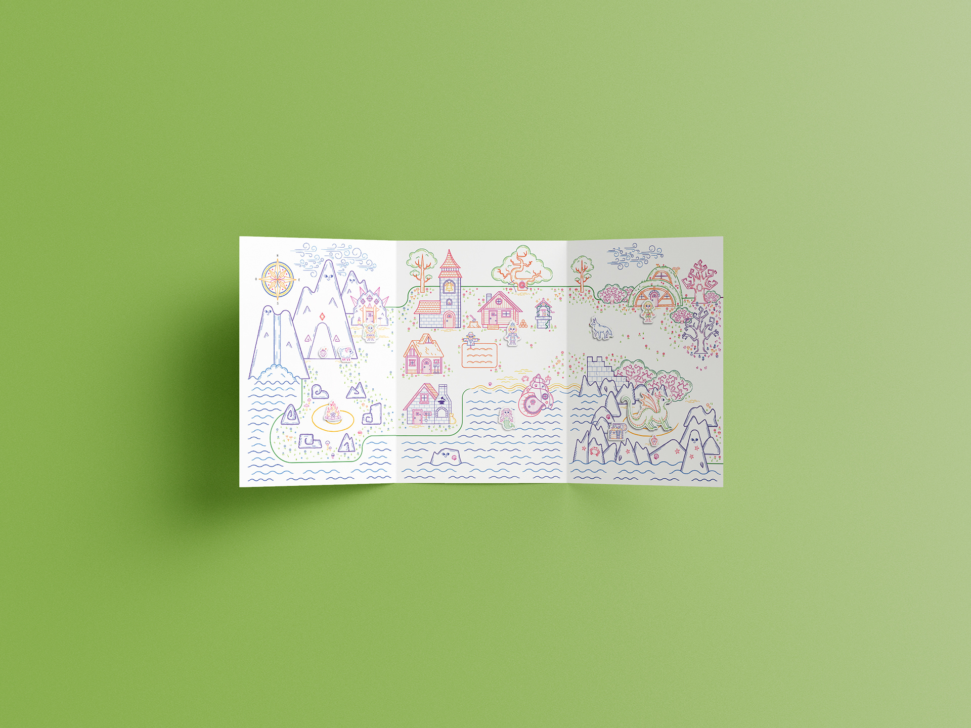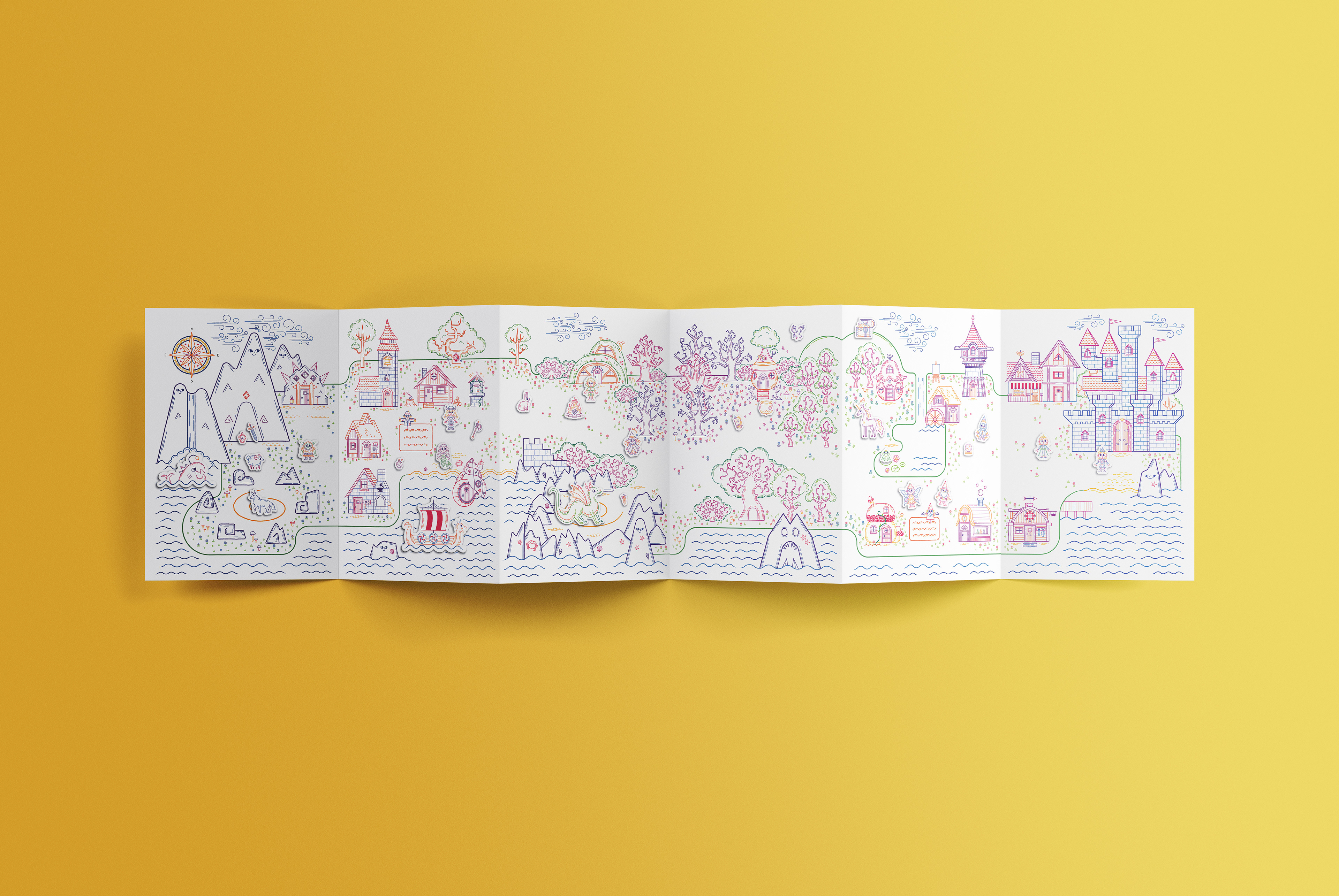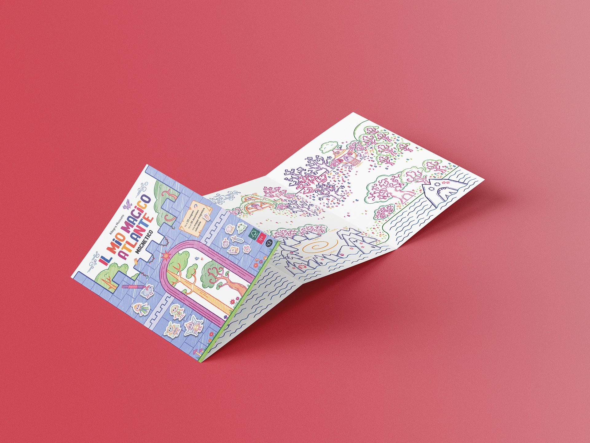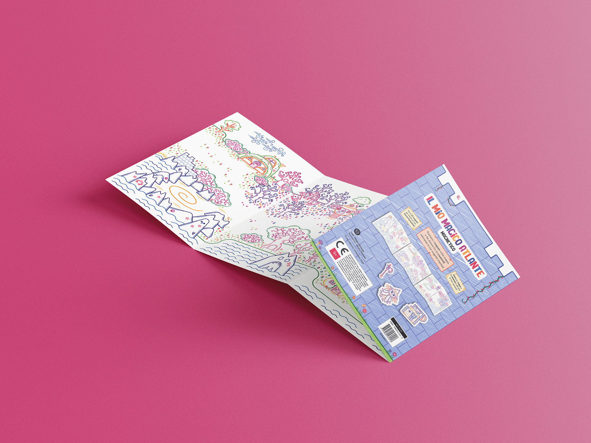 Born from the desire to replicate the freedom of drawing on my walls, the project's core mission is to stimulate storytelling and coloring creativity in children aged 4+. This magnetic leporello offers a customizable, endless game where children can color and manipulate magnetic characters on a fantastical map.