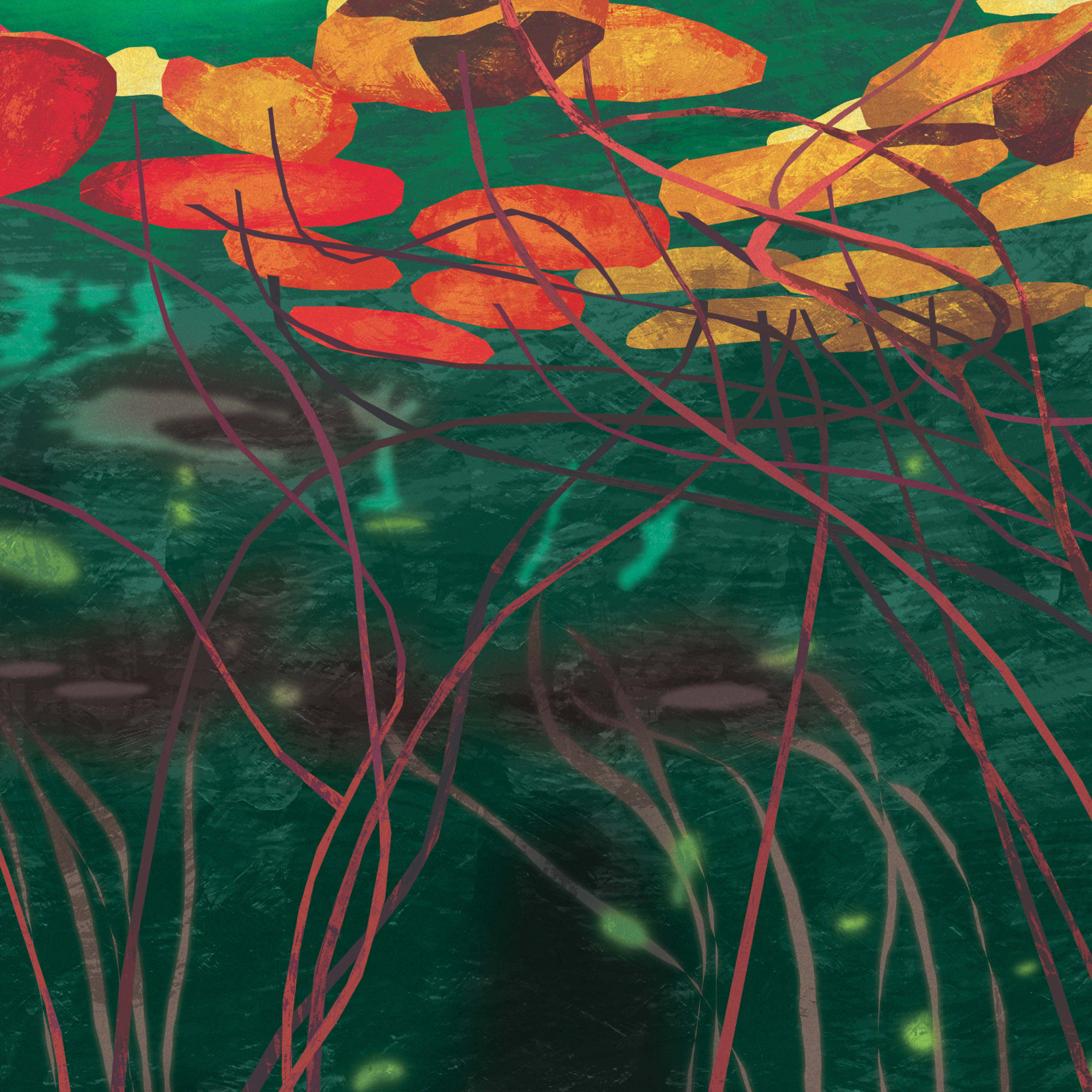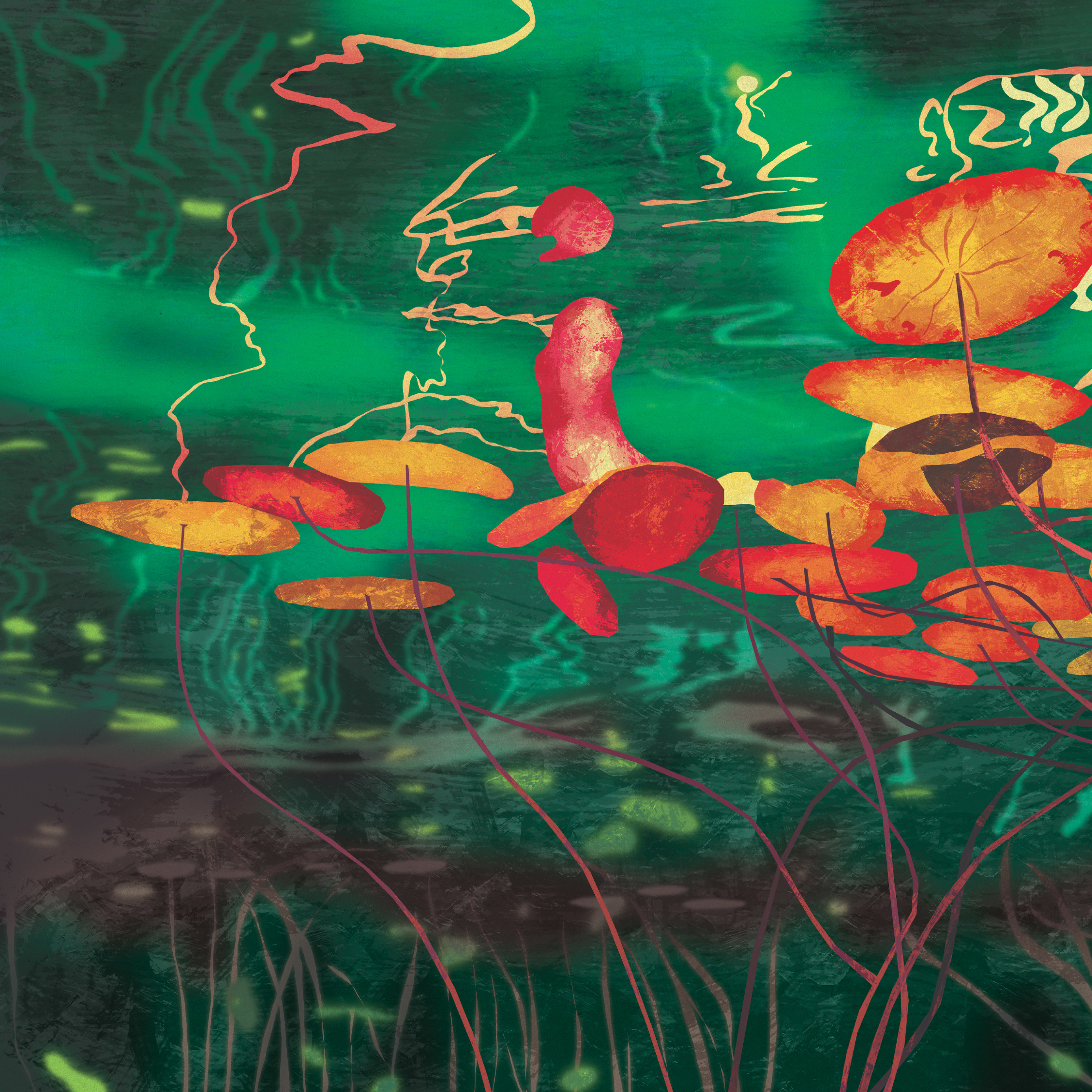 A deep dive into color theory and reflection for this new study. This piece captures the complex, silent world beneath the surface—lily pads and roots viewed through layers of vivid, abstract light.